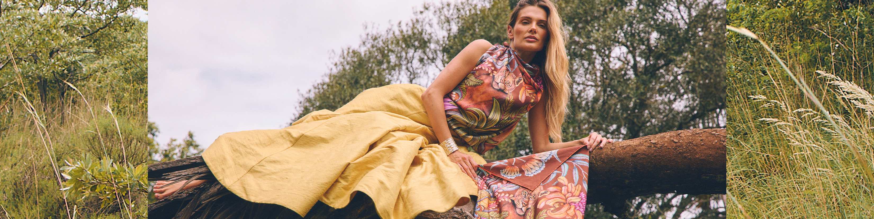 in our Phinda Pride scarf design. They gaze through the lush dense foliage of the Lebombo Wattle forest, where iridescent Turacos fly overhead, exposing their green and red plumage.