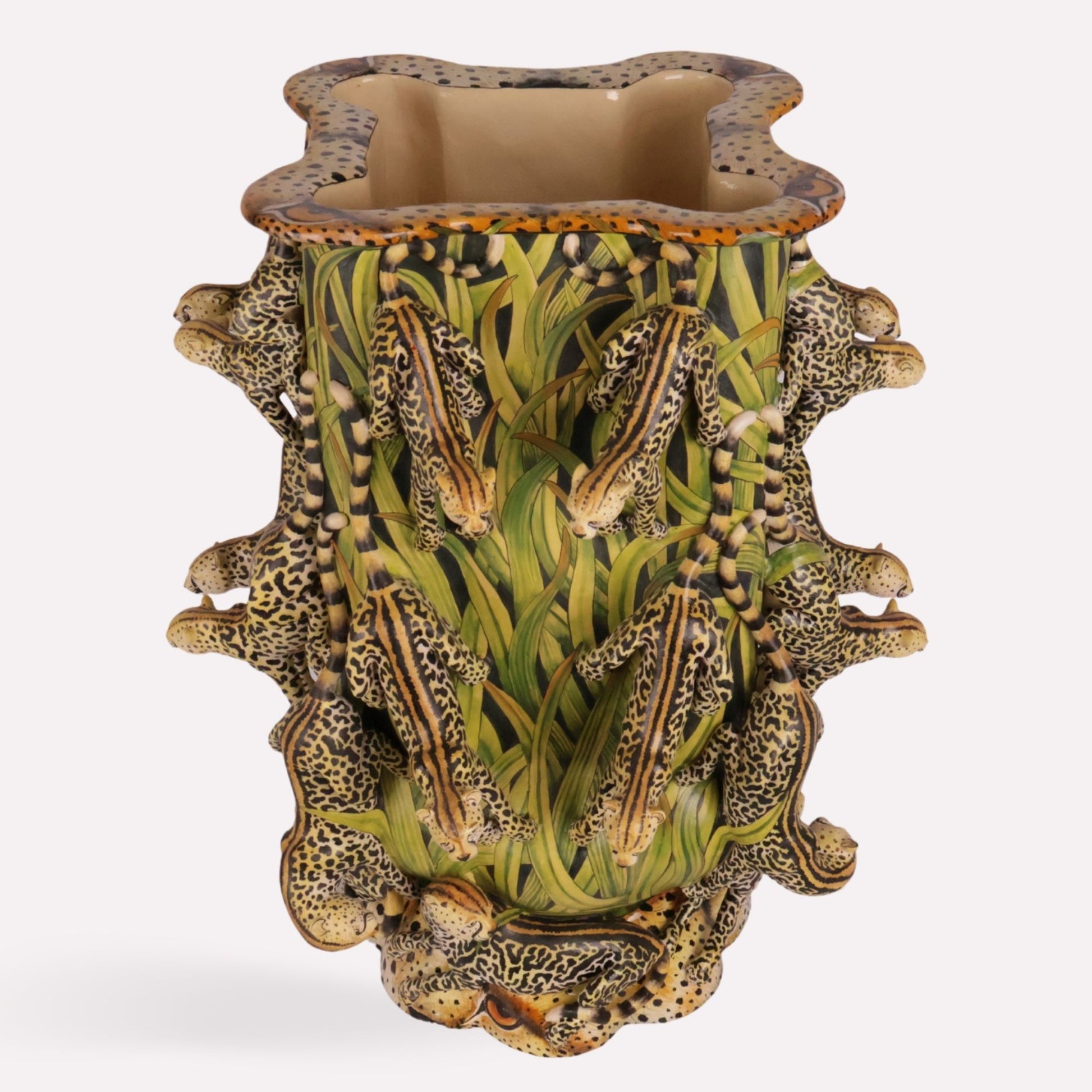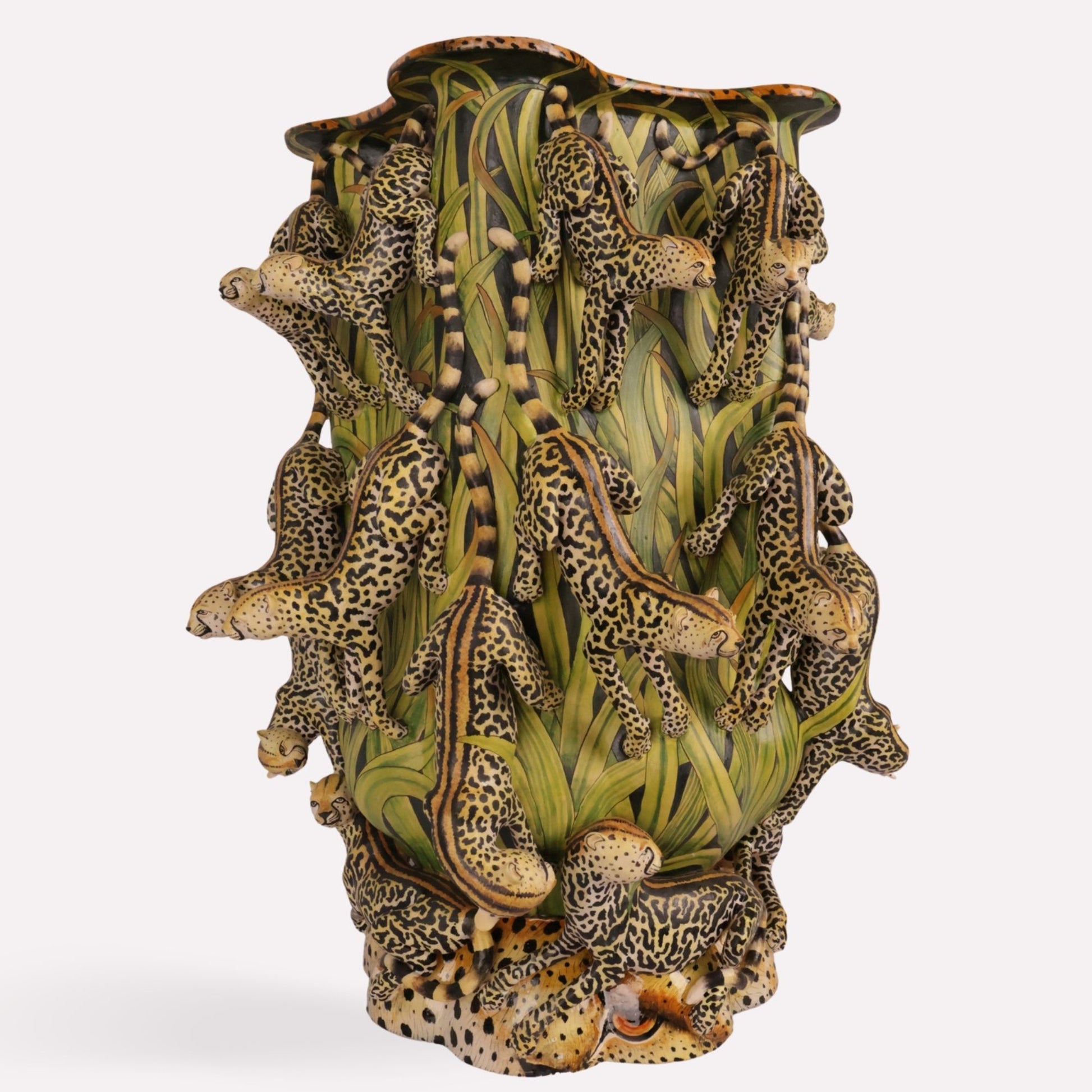 Molapo and Siyabonga’s King Cheetah vessel captures the rhythm of the African grasslands, its form seeming to sway as though the wind lifts the cheetah’s tails and stirs the blades of grass beneath them. Inspired by the 2025 Cheetah Prowl wallpaper design, these remarkable artists have transformed a two-dimensional rendering into a masterfully crafted three-dimensional work of art.
