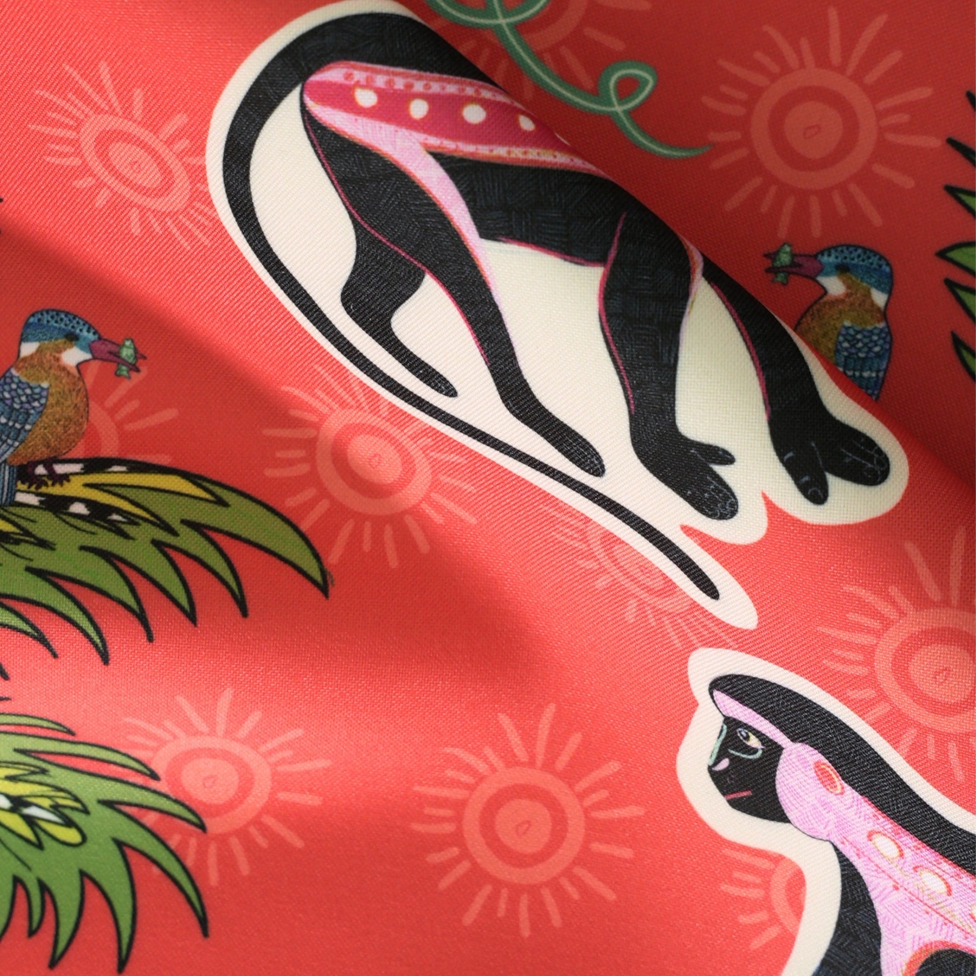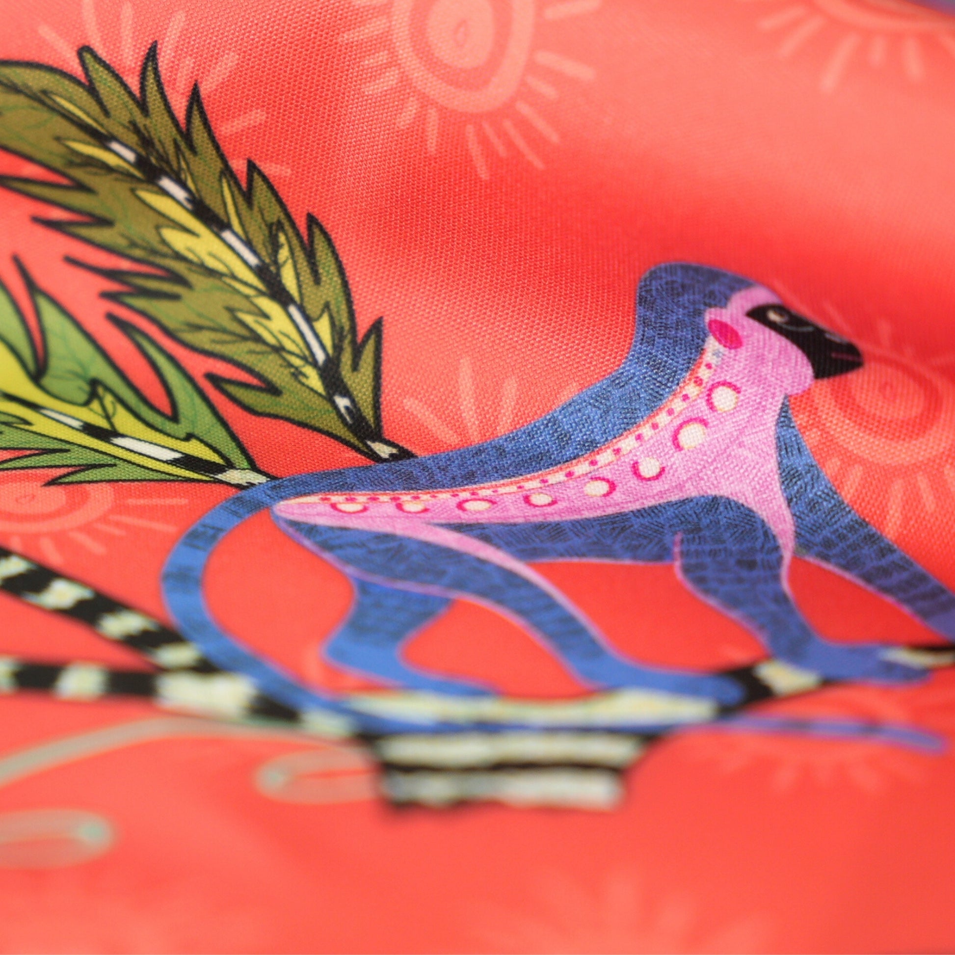 Monkey Palm is a much-loved design from the Q range, featuring a charming cut-out motif of a naïve monkey nestled among palm trees and birds. Evolving from the Wonderboy Wisdom narrative, this playful yet symbolic design returns in 2026, reimagined in rich mango orange and glowing sunset colourways.