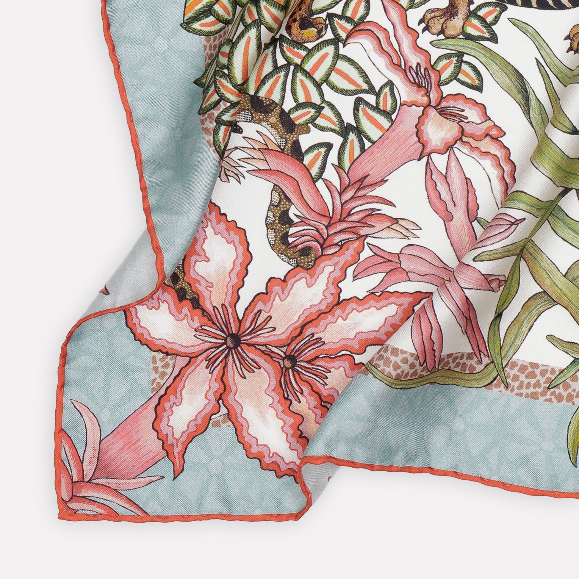 The Sabie Kings design, used for the silk scarf and safari wrap for Ardmore, was inspired by the majestic Sabie King Cheetah, first observed in 1926 in Fée's birthplace of Zimbabwe. As the two cats play together, their tails become entwined amidst indigenous aloes and impala lilies. The palette of earthy safari tones, seafoam teal, blues, lush green, and vibrant summer hues speaks to their connection with nature and with each other.