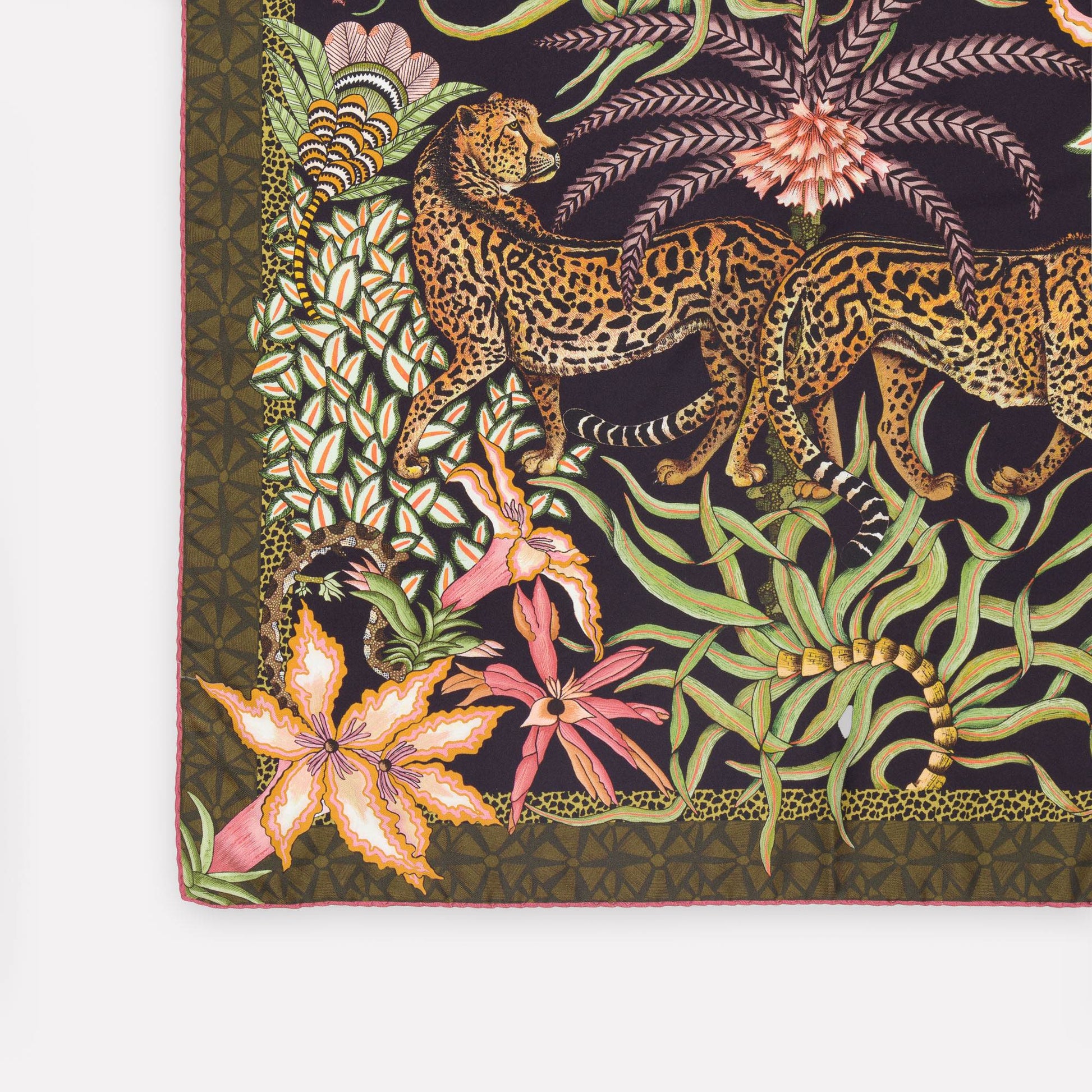The Sabie Kings design, used for the silk scarf and safari wrap for Ardmore, was inspired by the majestic Sabie King Cheetah, first observed in 1926 in Fée's birthplace of Zimbabwe. As the two cats play together, their tails become entwined amidst indigenous aloes and impala lilies. The palette of earthy safari tones, seafoam teal, blues, lush green, and vibrant summer hues speaks to their connection with nature and with each other.