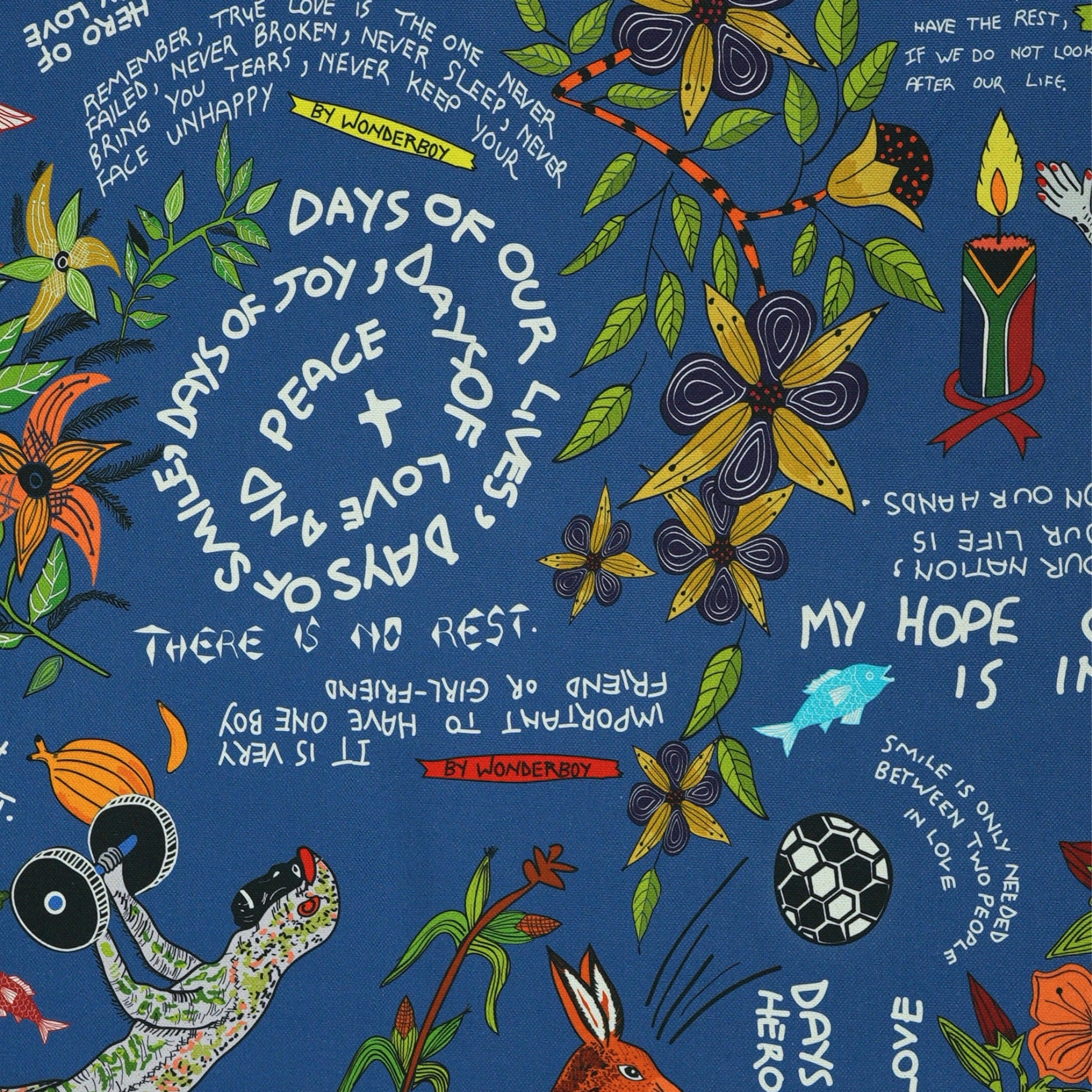 This evolution represents a deeply personal extension of the Wonderboy Wisdom fabric design, where floral motifs, skulls, and soccer- and gym-playing rabbits come together to celebrate a healthy, joyful African lifestyle.