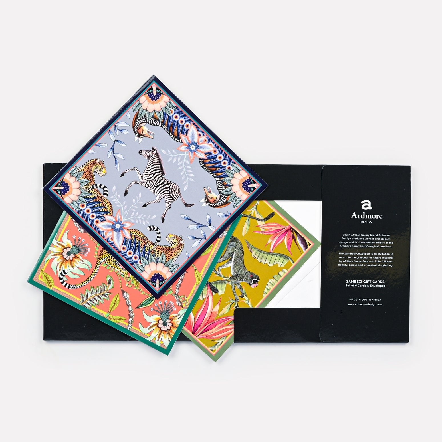 This curated collection features six distinct 14x14cm cards from the Zambezi Collection, each accompanied by a 14.5x14.5cm envelope, elegantly presented in a 15x15cm box lined with Ardmore's signature print.